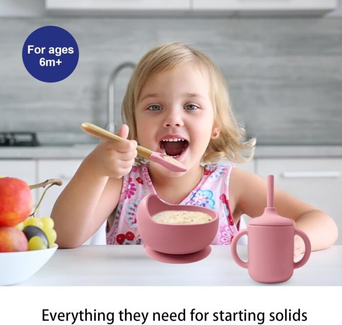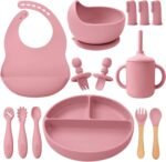 Baby Feeding Set: Get your baby to love mealtime and free up mom’s hands! This 14-piece baby feeding set includes 1 suction-divided plate, 1 suction bowl, 1 wooden fork, 1 wooden baby spoons, 1 straw cup, 1 spill-proof straw, 1 baby bib with a catch pocket, 1 first-stage toddler fork, 1 first-stage toddler spoon, three training spoons, and 3 finger toothbrushes.