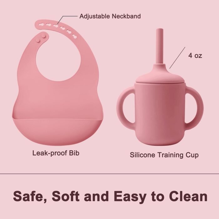 Baby Led Weaning Supplies: Our silicone bib is designed with a deeper and sturdier pocket, making it highly effective in catching dropped food and easy to clean. The adjustable circular design is particularly gentle on your baby’s skin. Our training cup is expertly crafted to fit snugly in your baby’s small hands and mouth, safeguarding their developing teeth. Furthermore, the straw is equipped with a spill-proof function, aiding babies in transitioning from breastfeeding and promoting independent drinking.