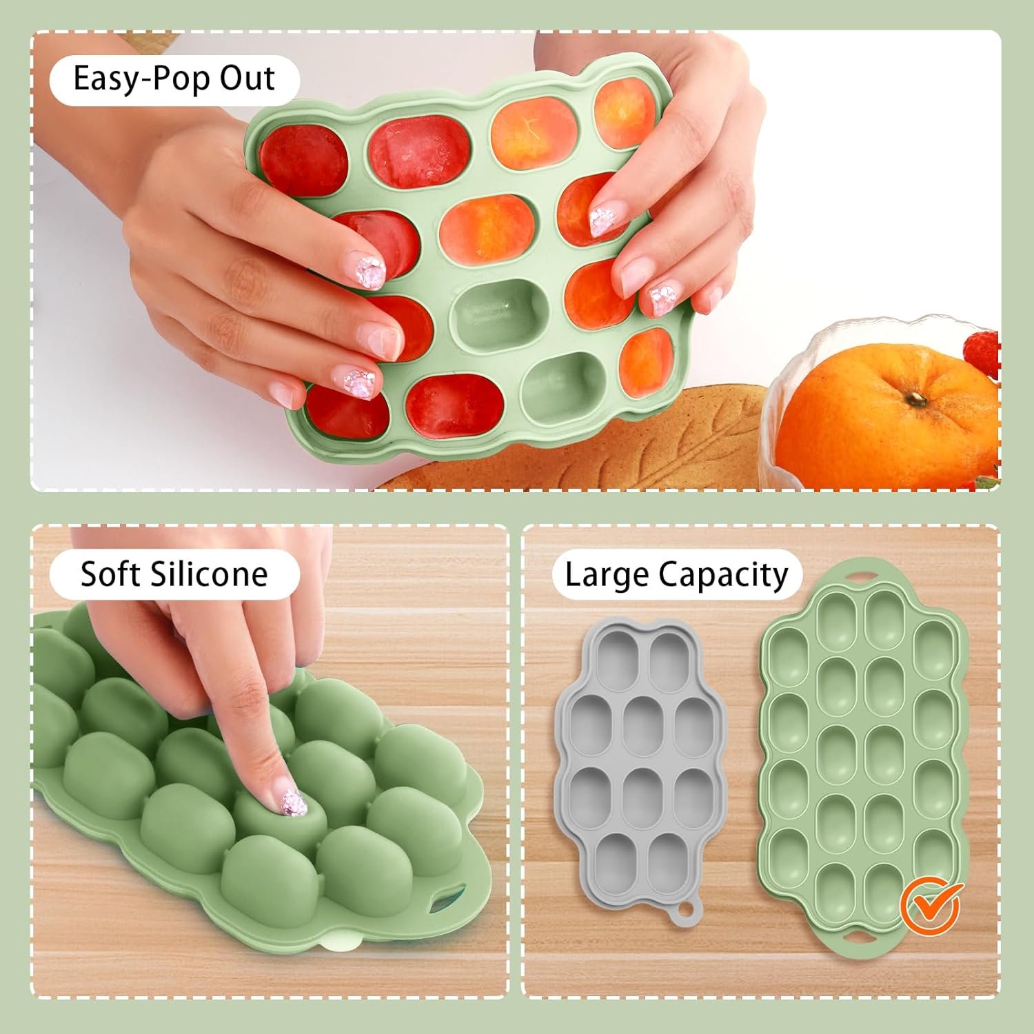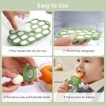 【MULTI-FUNCTIONAL BABY FRESH FRUIT FEEDER】: The silicone baby food freezer tray with 18 portion can meet the needs of preparing multiple complementary foods at once, you can put breastmilk, purees, juices, vegetables or some other baby food to freeze, save preparation time and improve efficiency. Simply push the bottom of the frozen tray and the ice cubes can be easily demolded