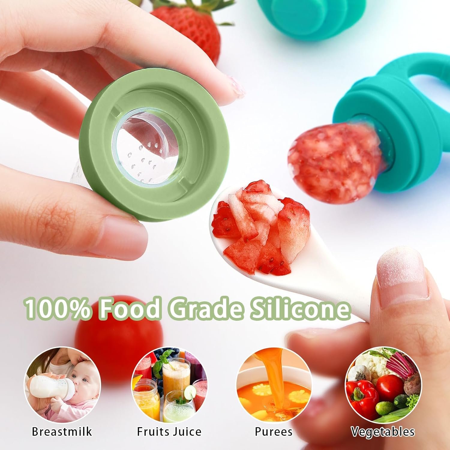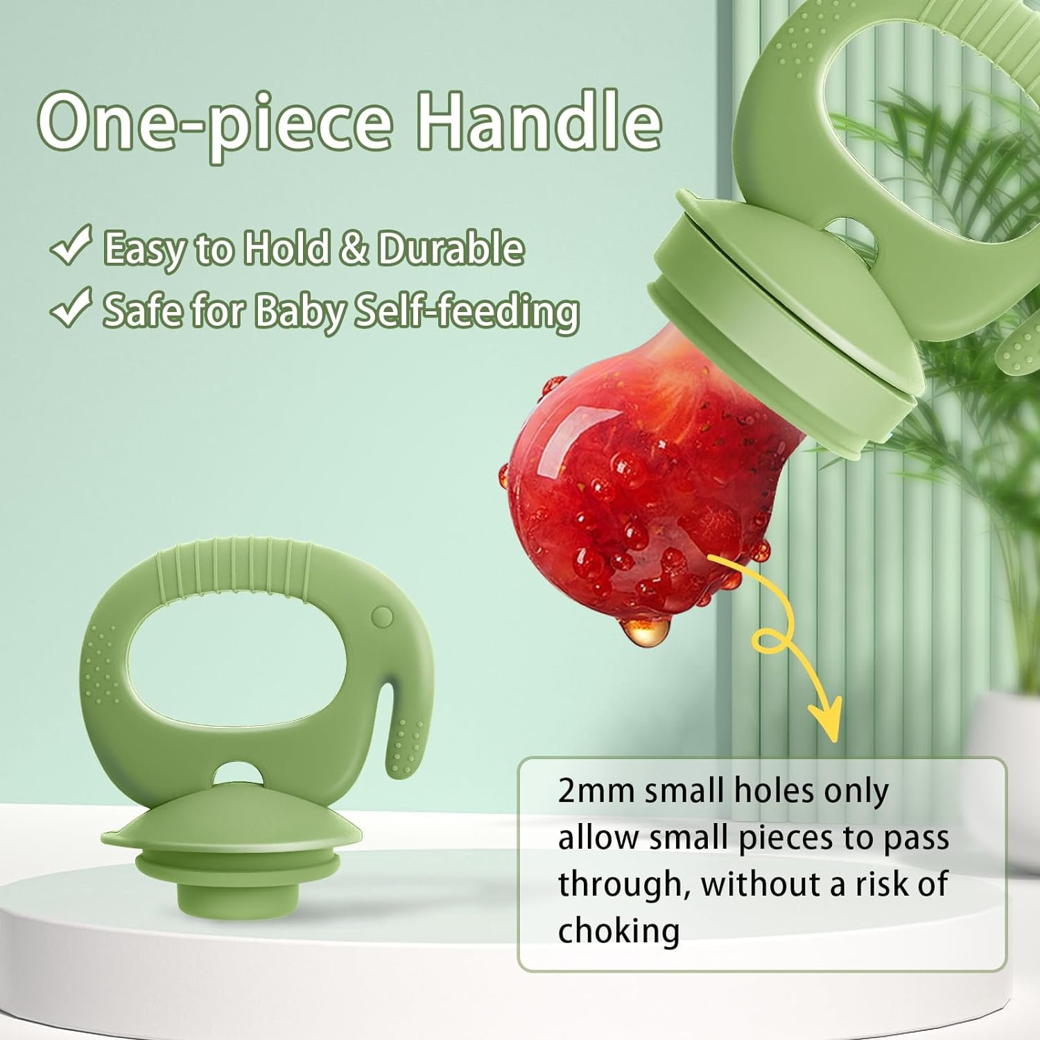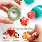 【SAFE WAY FOR BABY TO USE】: This silicone baby feeder features an integrated design with no small components to prevent babies from swallowing. The silicone pouch with 2mm small hole diameter, only allows small pieces pass through, without a risk of choking, ensuring the safety of babies