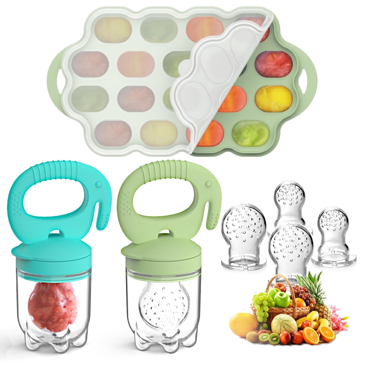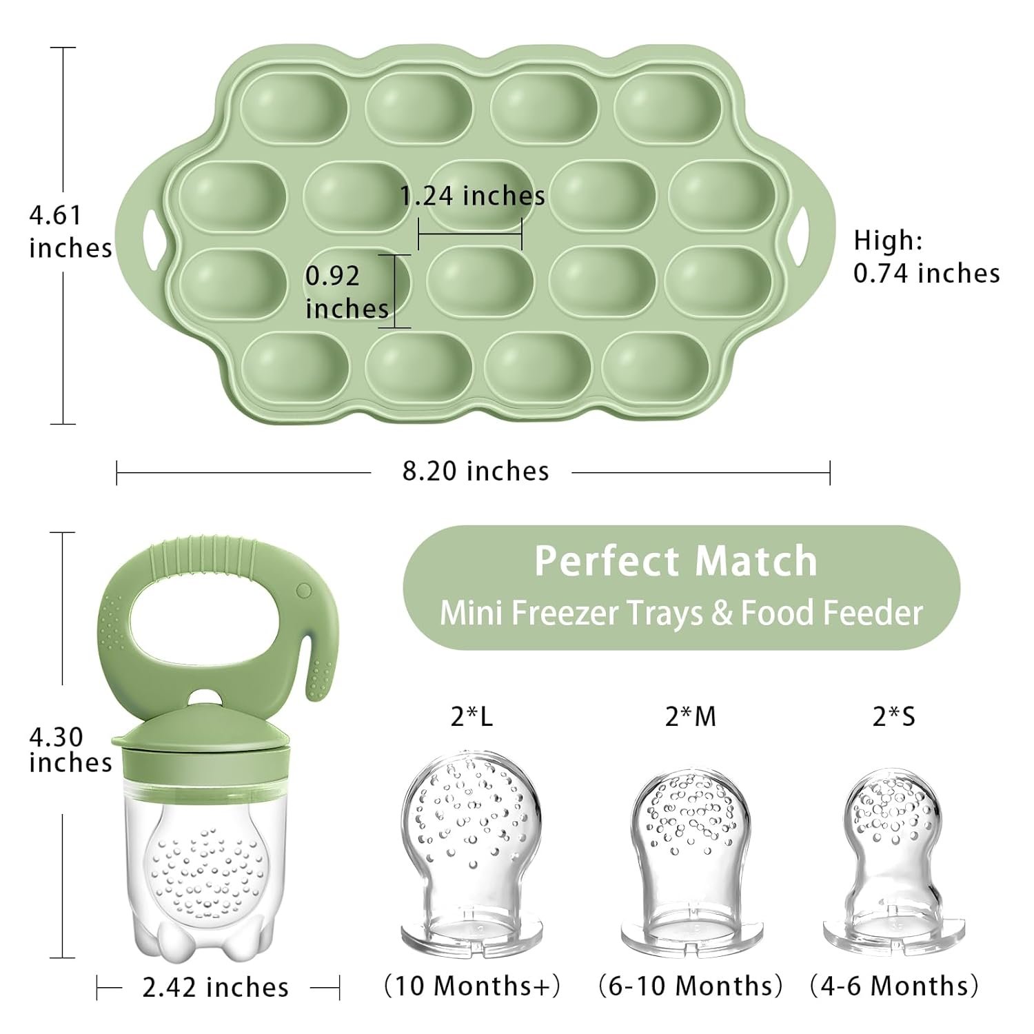 【BASIC INFORMATION】:Material: 100% Food Grade Silicone, BPA Free, non-toxic, no-odor. Pacakge include: 2 x Baby Food Pacifier Feeders; 1 x Baby Food Freezer Tray; 6 x Soft Food Pouches (2*S/2*M/2*L). Suitable for babies over 4 months old
