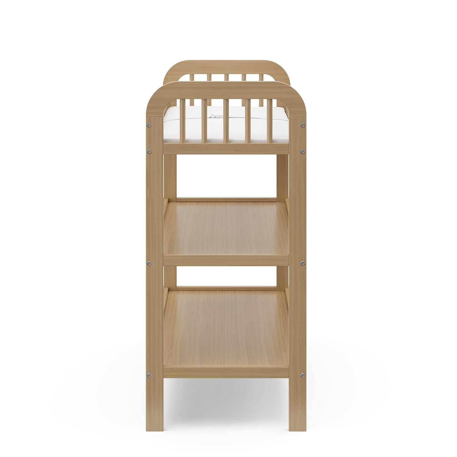 Bring your dream nursery to life with the Storkcraft Pasadena Changing Table, complete with a bonus water-resistant changing pad. With its clean lines, stylish curves, rounded details, and easy-to-match design, the Pasadena is the perfect addition to any nursery – no matter your style. The Pasadena features 2 open, spacious storage shelves and includes a bonus water-resistant changing pad with safety strap. Pair your Storkcraft Pasadena Changing Table with the matching Storkcraft Pasadena 3-in-1 Convertible Crib, or pair this easy-to-match changing table with any other crib of your choice. The Storkcraft Pasadena Changing Table is GREENGUARD Gold Certified – certified products are screened for more than 10,000 chemicals and VOCs known to pollute indoor air. The Pasadena Changing Table is crafted with pine wood, pine wood dowels, and wood composites, and its applied finish has been tested to meet or exceed the applicable ASTM and CPSIA safety standards. Also, like all Storkcraft changing tables, the Pasadena is JPMA Certified — meaning it’s been expert tested to meet or exceed all applicable category voluntary and mandatory safety standards. Storkcraft is the proud recipient of the Parent Tested Parent Approved (PTPA) Seal of Approval for nursery and children’s bedroom furniture, and the 2023 Women’s Choice Award for 9 out of 10 Recommended Baby & Kids Furniture. Backed by a 1-year limited manufacturer’s warranty. Assembly required. Changing pad included.