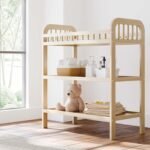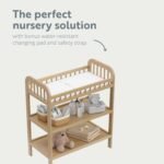 BONUS WATER-RESISTANT CHANGING TABLE PAD: Easy-to-match diaper changing table includes bonus water-resistant changing table pad and safety strap; Baby change table includes 2 spacious, open storage shelves to organize nursery and changing essentials