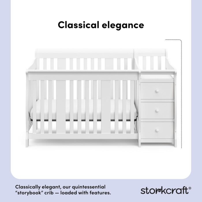Introducing the classically elegant, timeless and traditional Storkcraft Portofino 5-in-1 Convertible Crib and Changer – fit for a nursery fairytale. To make the Portofino even more special, its attached changing table includes a bonus waterproof diaper changing pad and safety strap — allowing you to change your baby on an easy-to-wipe, secure, and convenient surface. The Portofino is GREENGUARD Gold Certified, crafted from pine wood, engineered wood, and wood composites, and its applied finish has been tested to meet or exceed the applicable ASTM and CPSIA safety standards. The Portofino is Baby Safety Alliance Verified — meaning it’s been expert tested by third-party, accredited laboratories to meet or exceed all of the applicable category voluntary and mandatory safety standards. Designed to adapt to your growing baby, the Portofino’s adjustable mattress support base has 4 different height options, so the mattress support base’s position can be lowered as your child grows (please note, this crib may only be used until your child can easily climb out or is taller than 35 inches (89 cm). To support your child’s journey from babyhood to toddlerhood (and beyond), the Portofino is able to be converted from a crib to a toddler bed (compatible with 1 or 2 toddler safety guardrails – each sold separately), daybed, and full-size bed with headboard and optional footboard (compatible Storkcraft full-size bed conversion kit sold separately). The Storkcraft Portofino 5-in-1 Convertible Crib & Changer is designed to accommodate any standard full-size crib & toddler mattress (mattress sold separately — we recommend any Graco mattress). Since 1945, Storkcraft has been bringing dream nurseries and kids bedrooms to life – that’s nearly 80 years of dedication to nursery craftsmanship, safety, and design. Storkcraft has been recognized with industry awards from the likes of Fast Company, Parents, Baby Innovation Awards, and more, and is the proud recipient of the Parent Tested Parent Approved (PTPA) Seal of Approval for nursery and children’s bedroom furniture. The Portofino is backed by Storkcraft’s supportive, real-life Customer Care team and 1-year limited manufacturer’s warranty. Assembly required. Mattress sold separately. Compatible toddler safety guardrail(s) sold separately. Compatible crib-to-bed conversion kit sold separately.