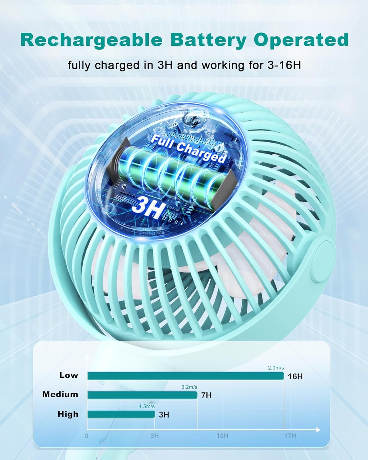 Wind Speed Settings 3 (Low/ Medium/ High) Powered Source Battery & USB Charging Voltage 5V/2A Charging Time 3H Time for Working 3-16H Diameter of the Fan 145mm/ 5.7inch Length of Tripod 180mm/ 7.1in Length of USB Type-C Cable 500mm/ 19.7inch Weight 12 ounce Color Blue