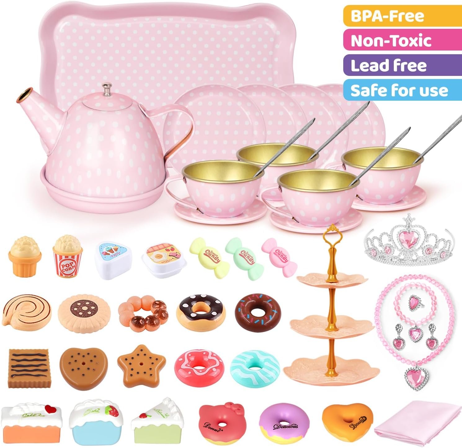 【PERFECT TEA SET FOR LITTLE HAND】This adorable kids tea set is designed for pretend play, includes 1 teapot, 1 serving tray, 4 cups, 4 spoon, 4 saucers, 4 plates, 1 crowns, 1 necklace, 1 bracelet, 1 rings, 1 pair earrings, 1 3-tiered cake stand, 1 tablecloth, 1 cardboard carrying case, 23pcs ABS Plastic pretend to play dessert with a variety of donuts, macaron, salad dressings, popcorn etc