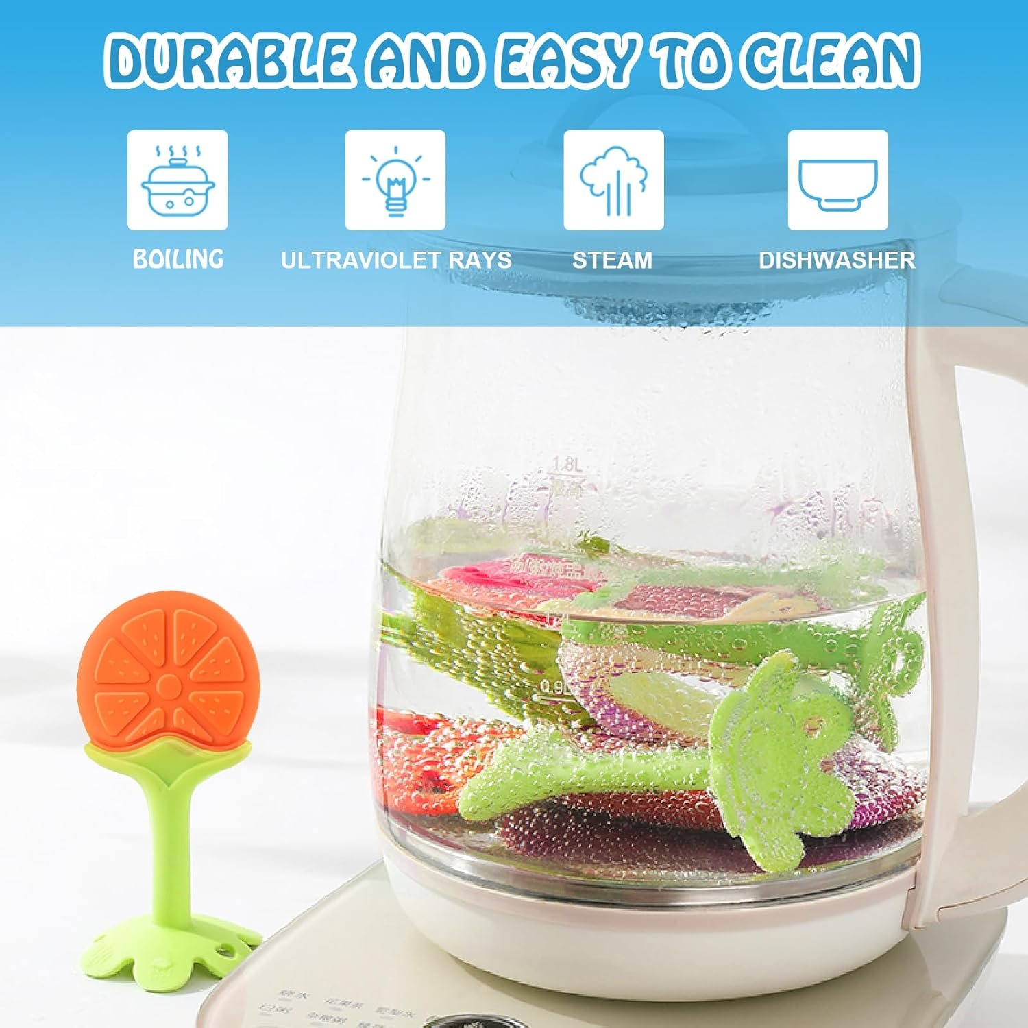 Multifunction Silicone Baby Teethers – You can teach your baby these fruits while they enjoy looking at the fruit teething toys and grinding their gums on it. Much better option for a baby to look at and easily identify over time to teach them some basic food labeling.
