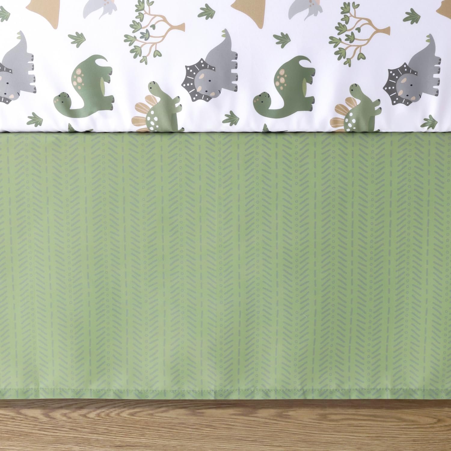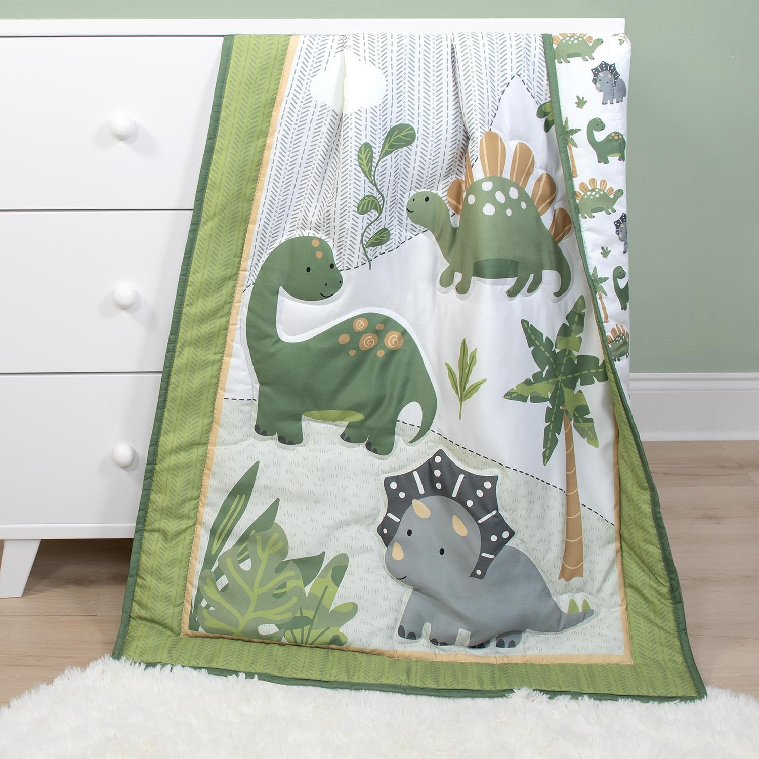 Jurassic Theme: Add a playful and soft touch to your toddler’s or baby’s nursery with a Jurassic theme featuring playful dinosaur friends on soft camo sage green and white.