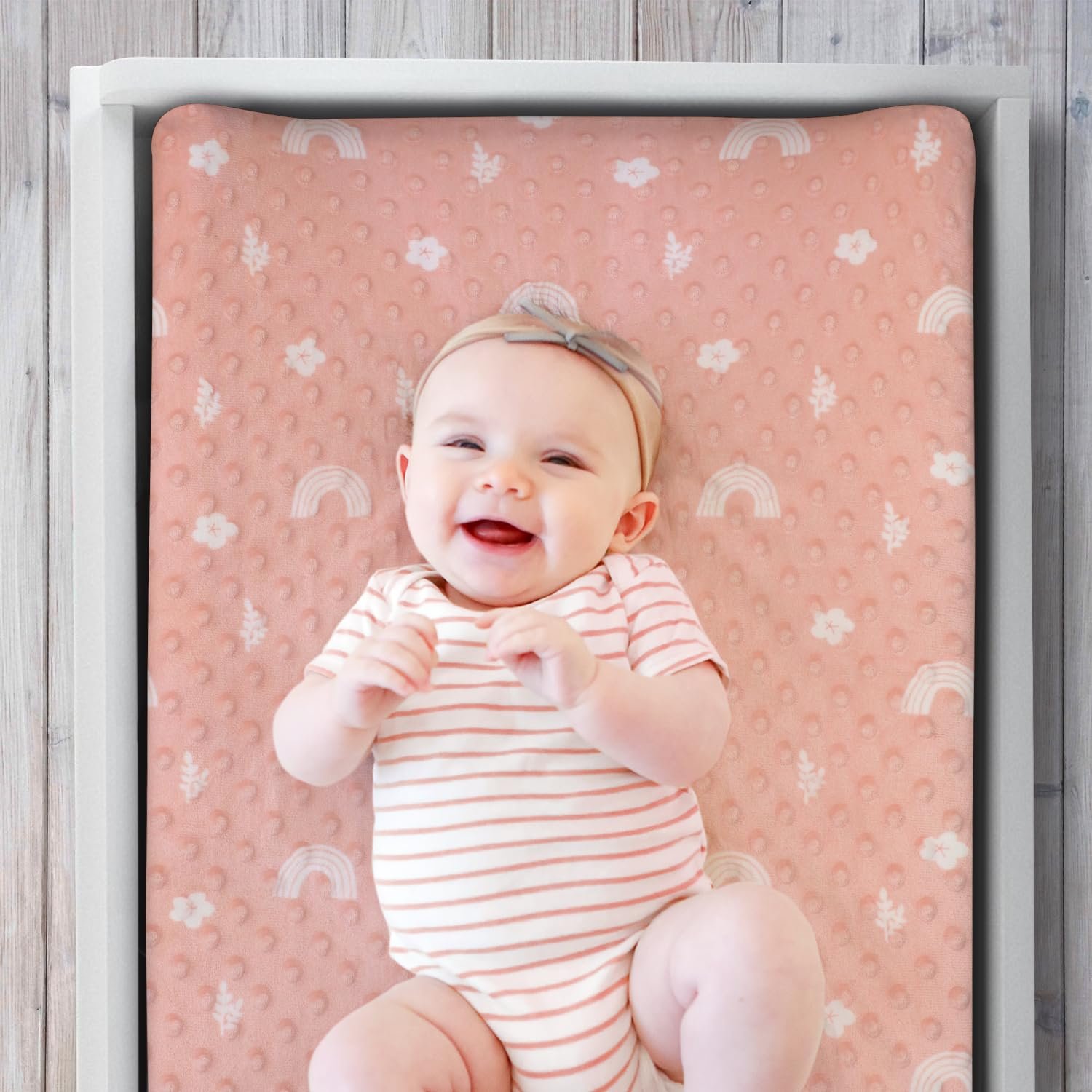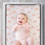 Add a touch of cheerful joy to baby’s nursery with the Rainbow Floral 3 Pack Plush Minky Changing Pad Cover by The Peanutshell. This delightful trio features two darling printed rainbow covers with delicate floral details and one pale pink solid option. The perfect addition to your baby girl nursery that are changing table must haves. Crafted from ultra soft minky dot velour, these covers provide the ultimate comfort for baby during every diaper change. Designed to be fade-resistant and machine washable for easy care; simply wash on a gentle cycle with similar colors, tumble dry on low or line dry. These diaper changing sheets fit standard changing pads with pockets up to 5 inches deep, the elastic bottom band ensures the covers stay securely in place. A convenient buttonhole allows for the use of changing pad straps, keeping baby safe and comfortable.