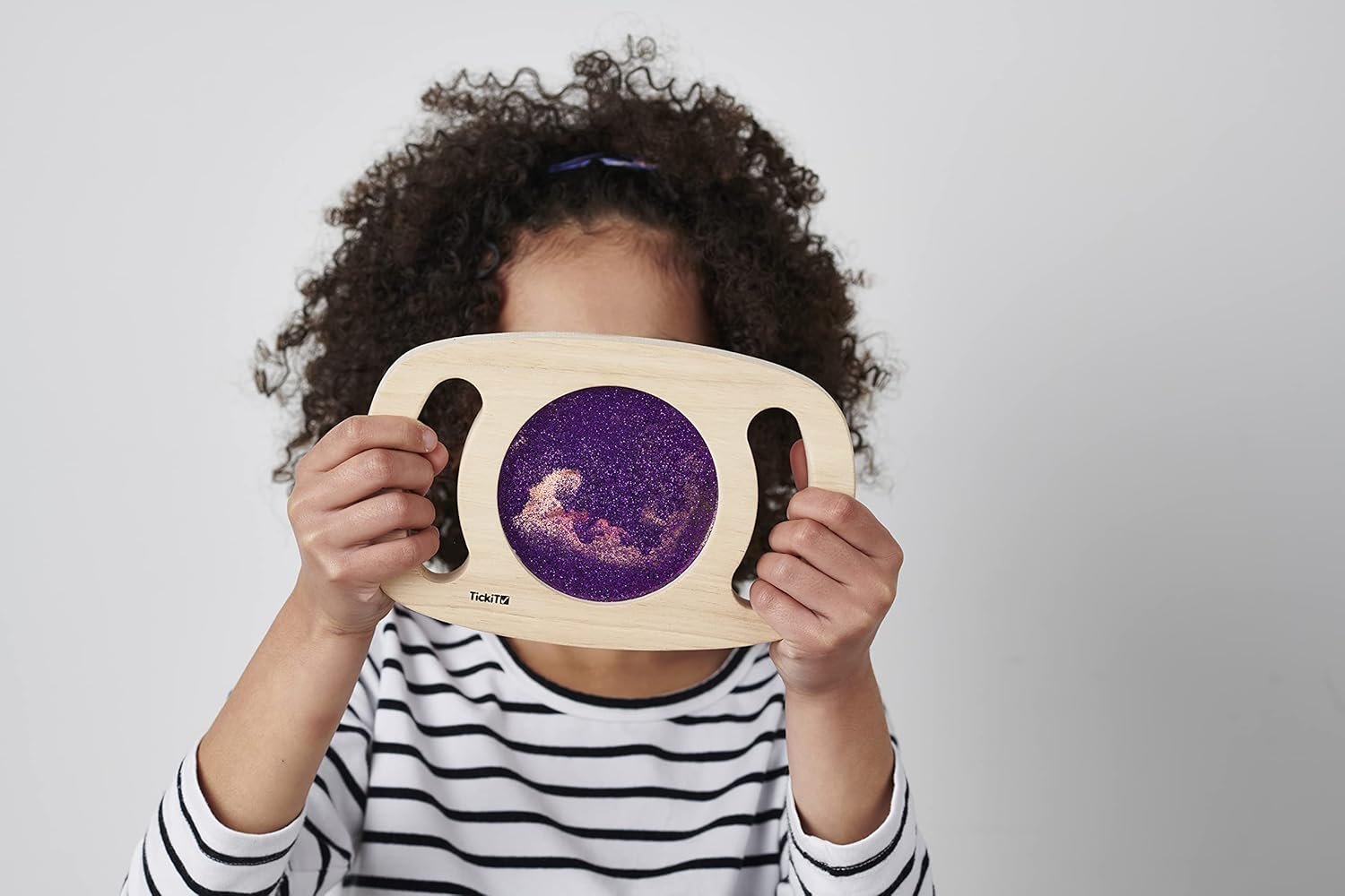 Our TickiT® Easy Hold Glitter Panels are easy to hold solid rubberwood frames with handles, enclosing different colourful sparkling glitter inserts that will help your child to engage with the world around them in a unique way. Use with our range of Light Panels to enhance the experience. In a choice of purple, silver and gold, these beautiful glitter panels offer a fascinating sensory and magical perspective of their environment; as the glitter twists and swirls the movement will capture your child’s curiosity. Perfect for sensory discovery and encouraging descriptive vocabulary.