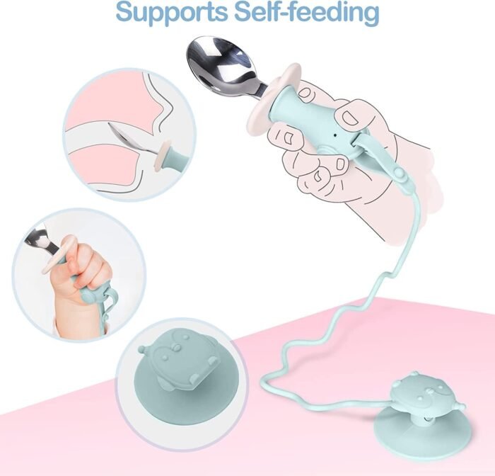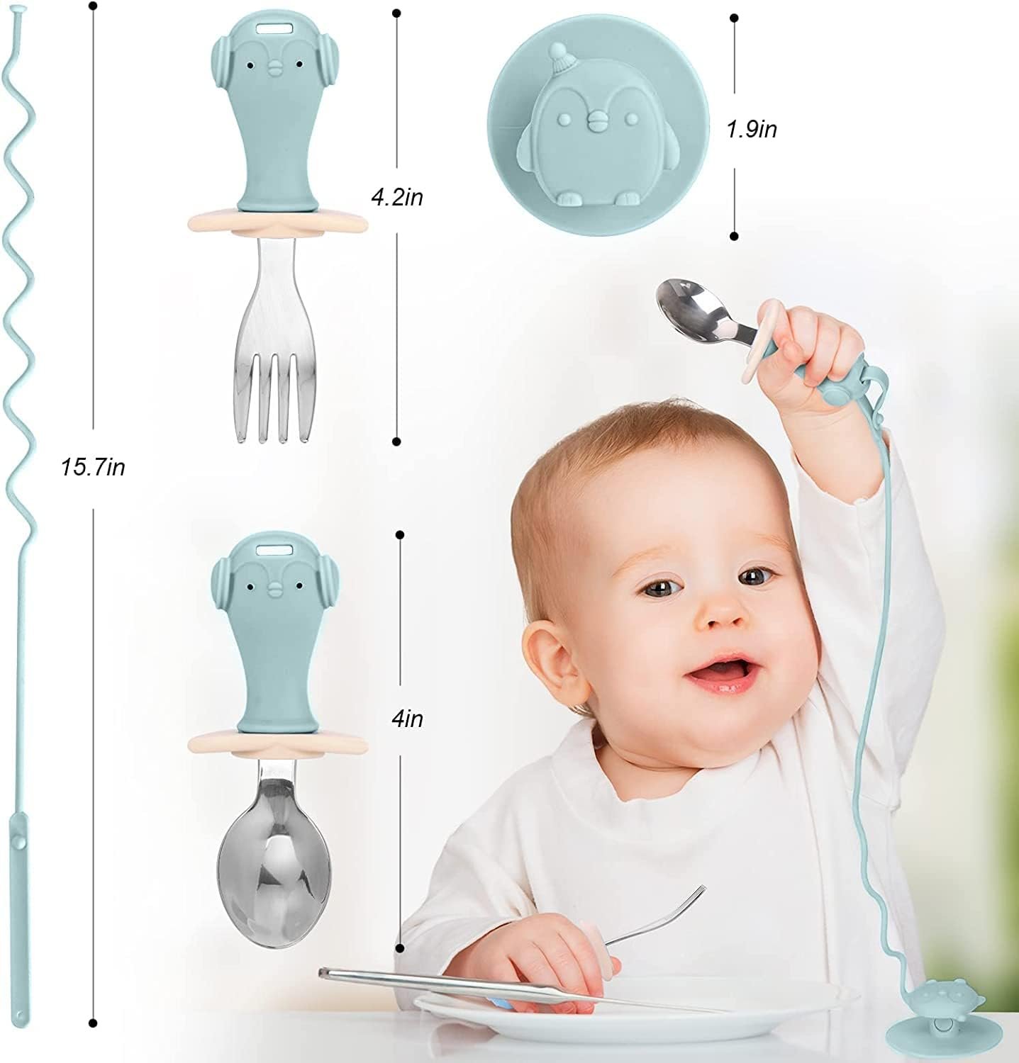 Toddler utensils have special designs with suction and chain that make self-feeding more smooth.