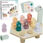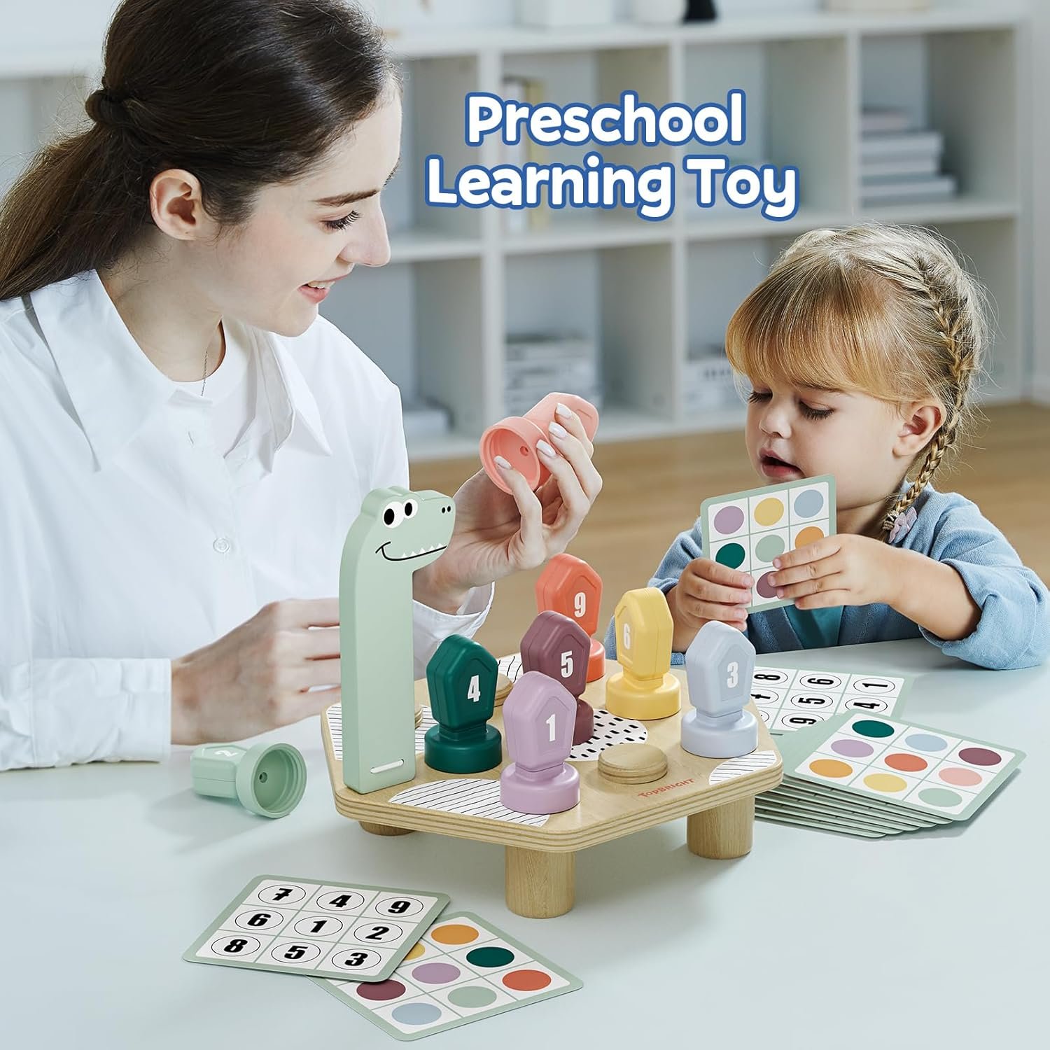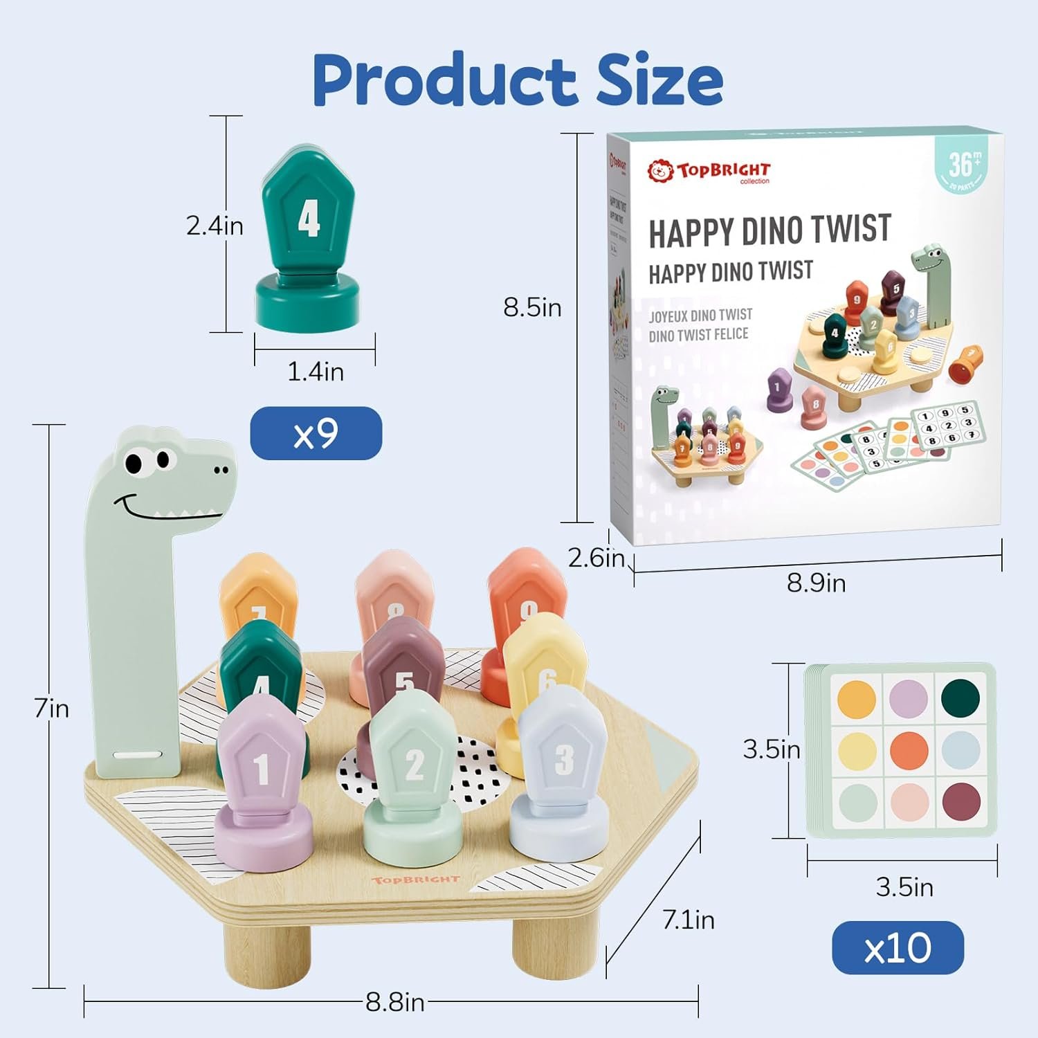 Preschool Learning Toys for Kids: The TOP BRIGHT Dinosaur Number and Color Matching Toy offers an engaging way for toddlers to develop essential skills. This Montessori toy includes 9 colorful bottle caps, 10 double-sided cards, and a friendly dinosaur, perfect for enhancing fine motor skills and cognitive development in children aged 3 4 5.