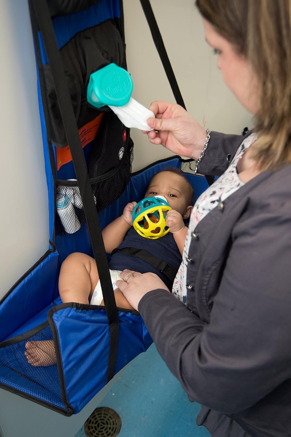 SAFE: You better believe it, sister. Baby Change-N-Go is painstakingly engineered with safety as the top priority, and has passed all U.S. and European safety standards with top marks. There is nothing we take more seriously than the wellbeing of your baby. There is a waist strap, but you know babies—they like to wiggle. That’s why we caution you to never, ever leave your little one unattended and always keep one hand on him in case he gets the urge to shake what you gave him.