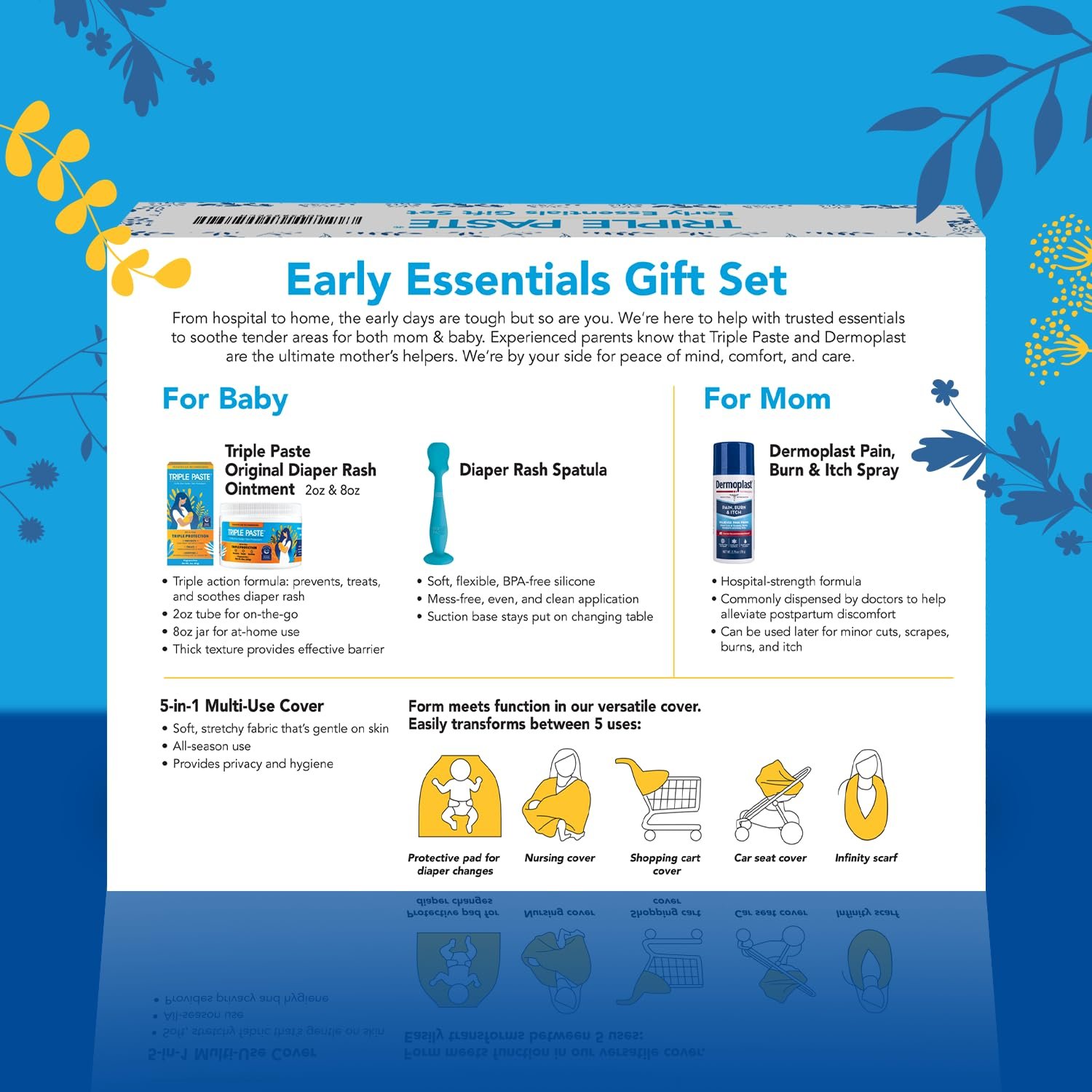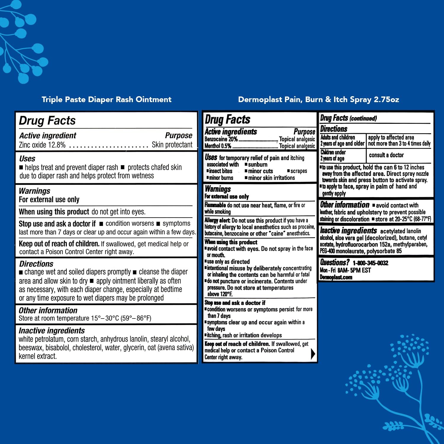 What’s included: One 2 oz. tube and one 8 oz. tub of Triple Paste Medicated Diaper Rash Ointment, one silicone spatula applicator, one 2.75 oz Dermoplast Pain, Burn & Itch Relief Spray, and a 5-in-1 multi-use cover