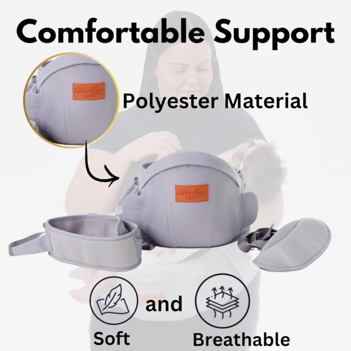 【All-Day Comfort】Made with soft, breathable polyester, this baby hip carrier ensures all-day comfort for your little one. Designed to evenly distribute weight across your hips and lower back, it reduces strain and supports extended wear for parents.