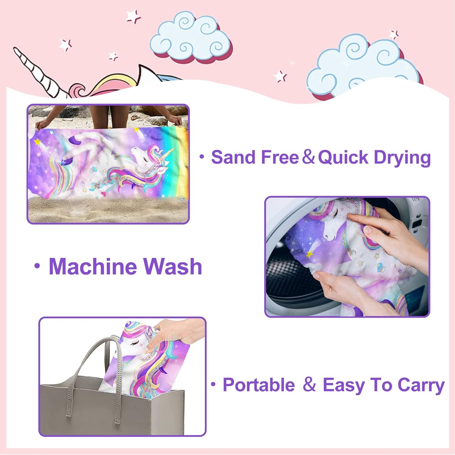 【Lightweight & Sandproof】Weight about 0.66 lb, lightweight and easy to take to travel. The sand will disappear when you shake this unicorn towel for girls. NOTICE: just printed on one side,with white back!