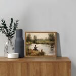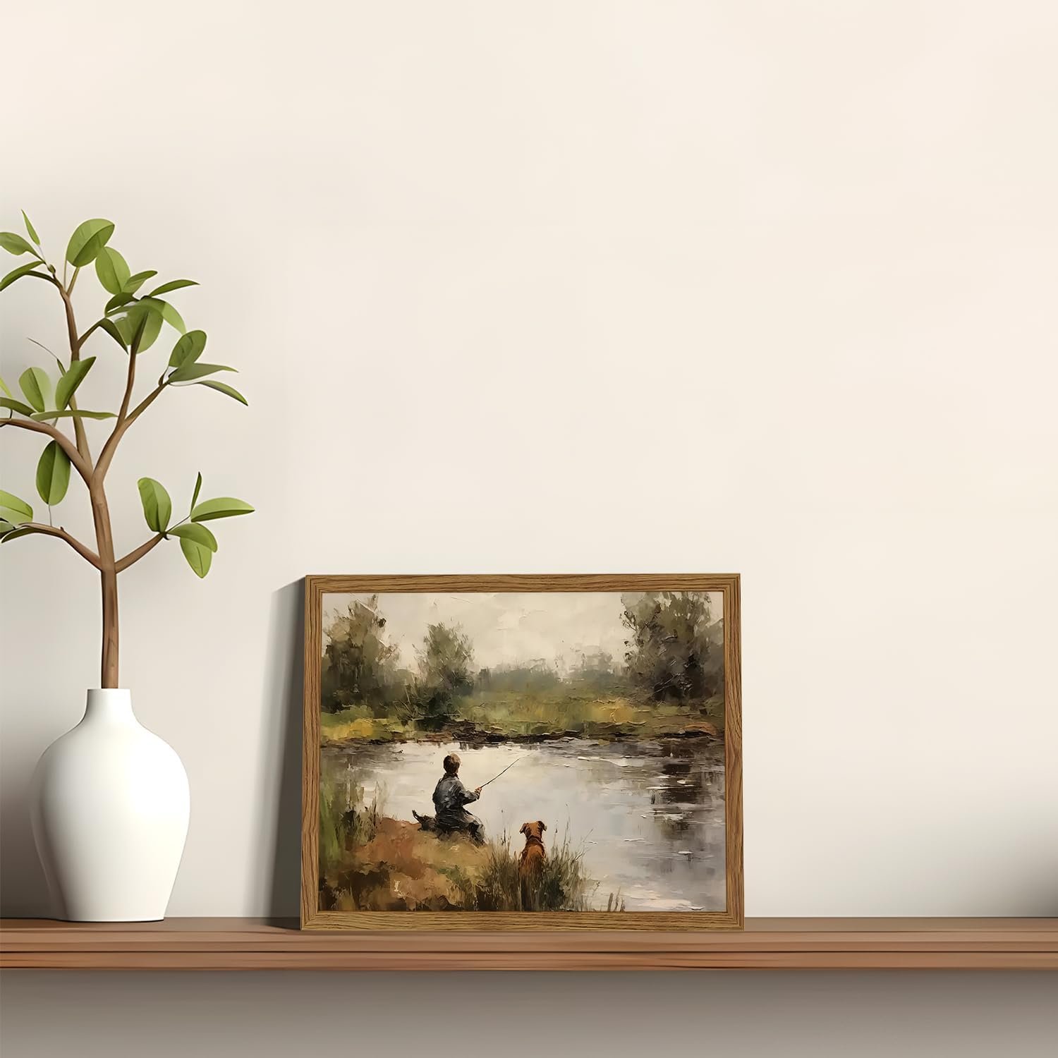 Vintage Boy Fishing Wall Art: This vintage wall art depicts a boy fishing by a tranquil lake accompanied by his dog, capturing the nostalgia for simpler times. This vintage country landscape painting evokes the warmth of childhood memories, making it the perfect addition to a cottagecore room, rustic bedroom, or country-themed nursery