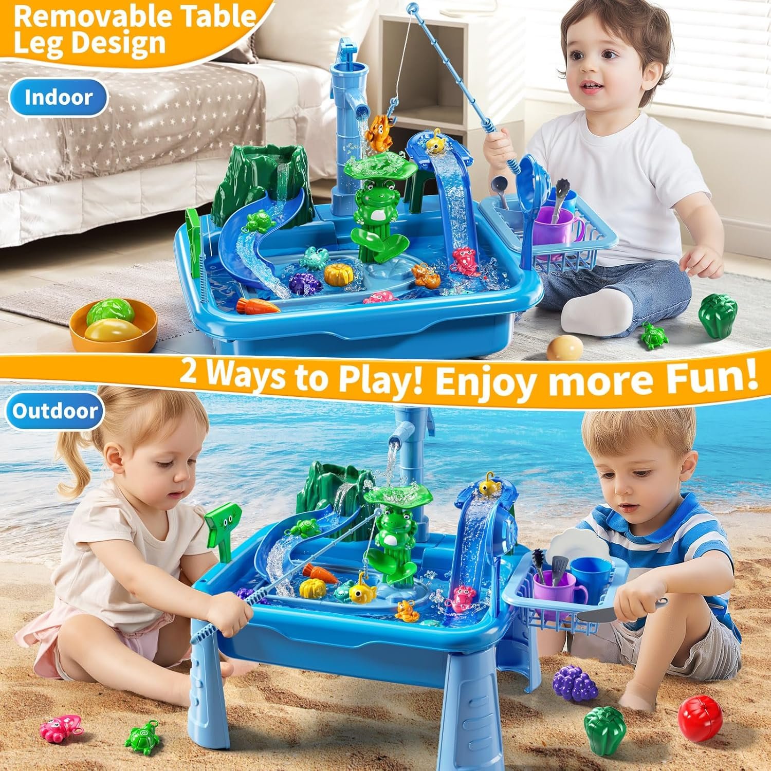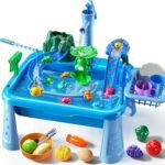 Pretend Fishing toys: The table legs of the summer activities for kids can be removed. The toy kitchen allows kids to play as interactive toddler toys. Playing beach toys for kids and fishing toys for shapes and color recognition