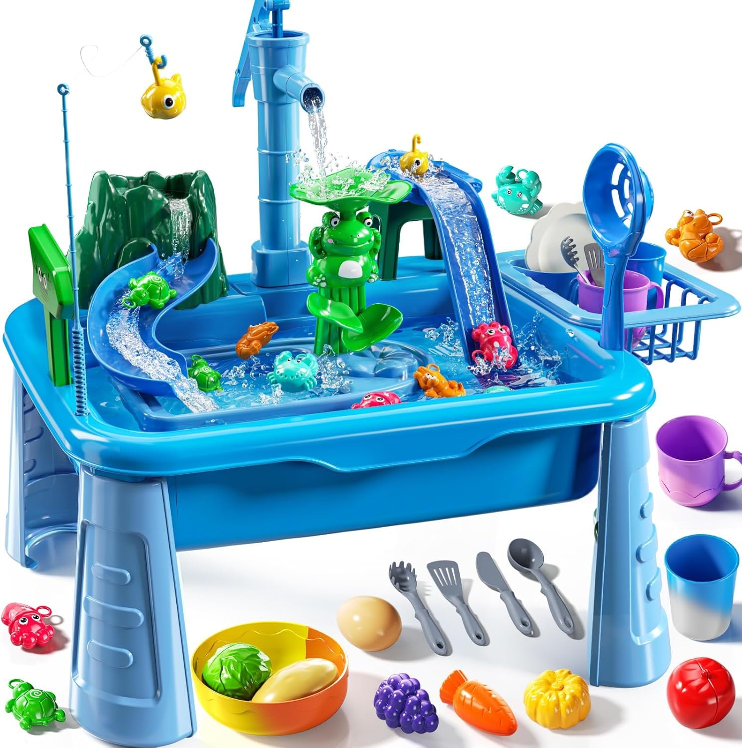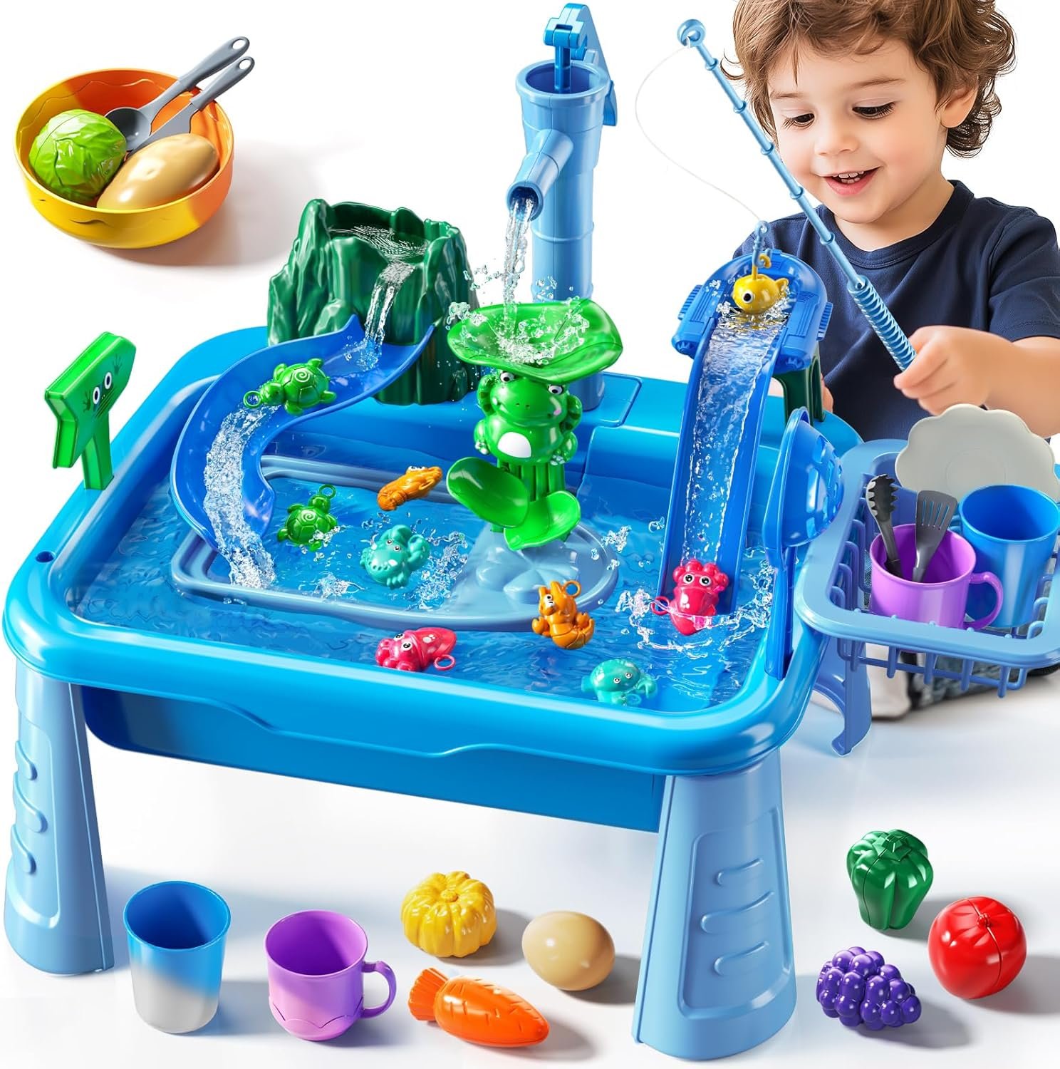 Water Table Toys: Play Sink with Running Water for toddlers(19.6×12.2×15.7 in) has fishing set for toddlers, 10 sea animal toys, water accessories toy, toy dishes and food. Kids learn to wash, fish and develop life skills