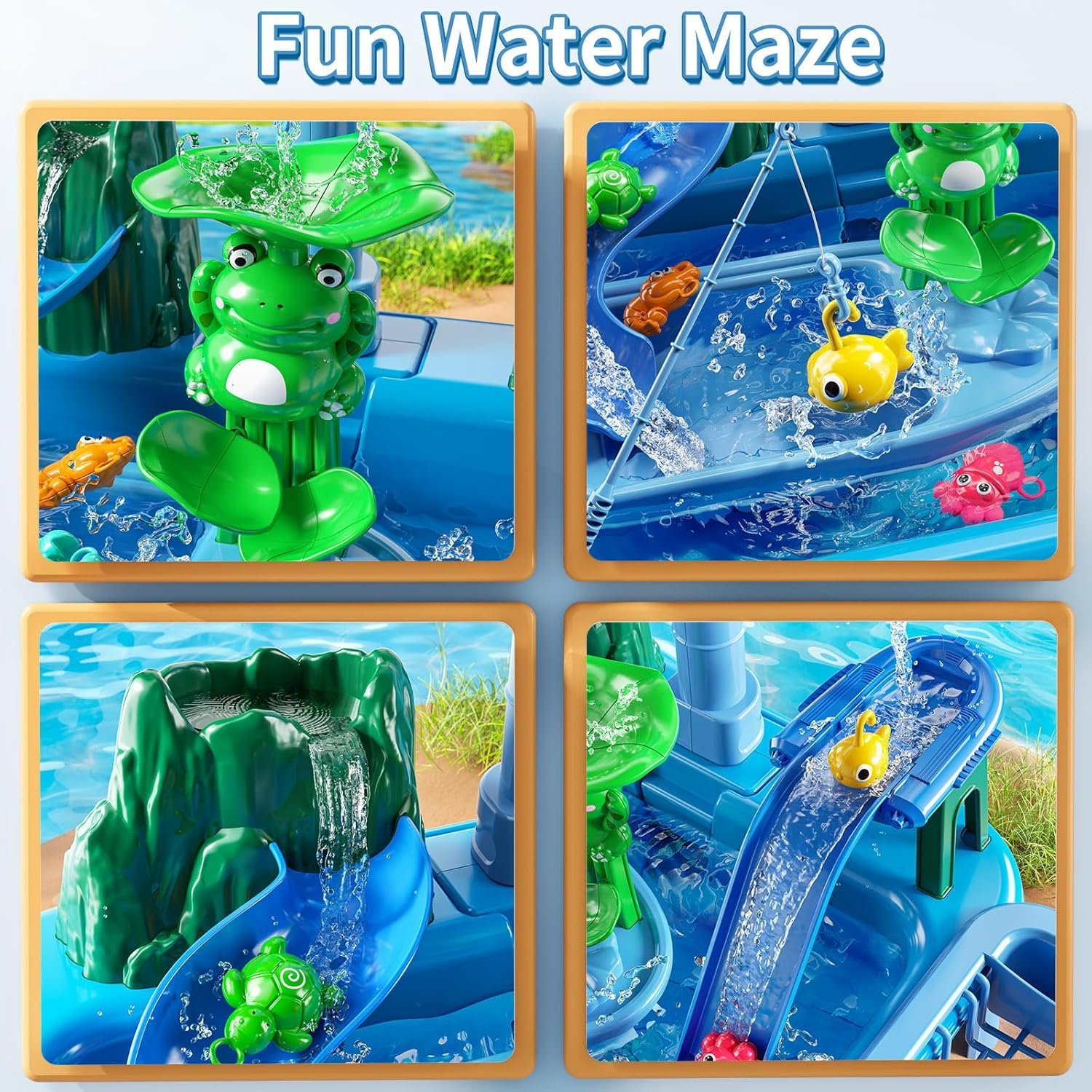 Automatic Water Circulation: Fill the summer toys with water, operate the 360° rotating water circulation toy faucet set, and water flowing comes down from the slides into it. Use fishing nets to catch fishes toys to help kids’ hands-on ability