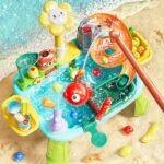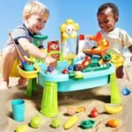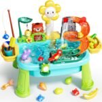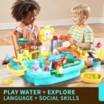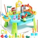 Deluxe Water Table Playset: This toddler water table will spark your children’s imagination, allowing them to dig and explore all kinds of fun water sensory activities in the play sink. It includes water park games projects, play kitchen sink and fishing game. Equipped with electric faucet, play food, color changing toy kitchen accessories, floating and fishing toys, etc., Endless fun for kids!