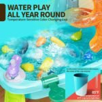 Water Games All Year Round: The kids water table is made of cold-resistant and heat-resistant materials, allowing children to enjoy playing with water all year round. It is equipped with temperature-sensitive color-changing cup. When the water temperature reaches 40°C+, it turns light blue, and the higher the temperature, the lighter the color. The color returns to normal after cooling.