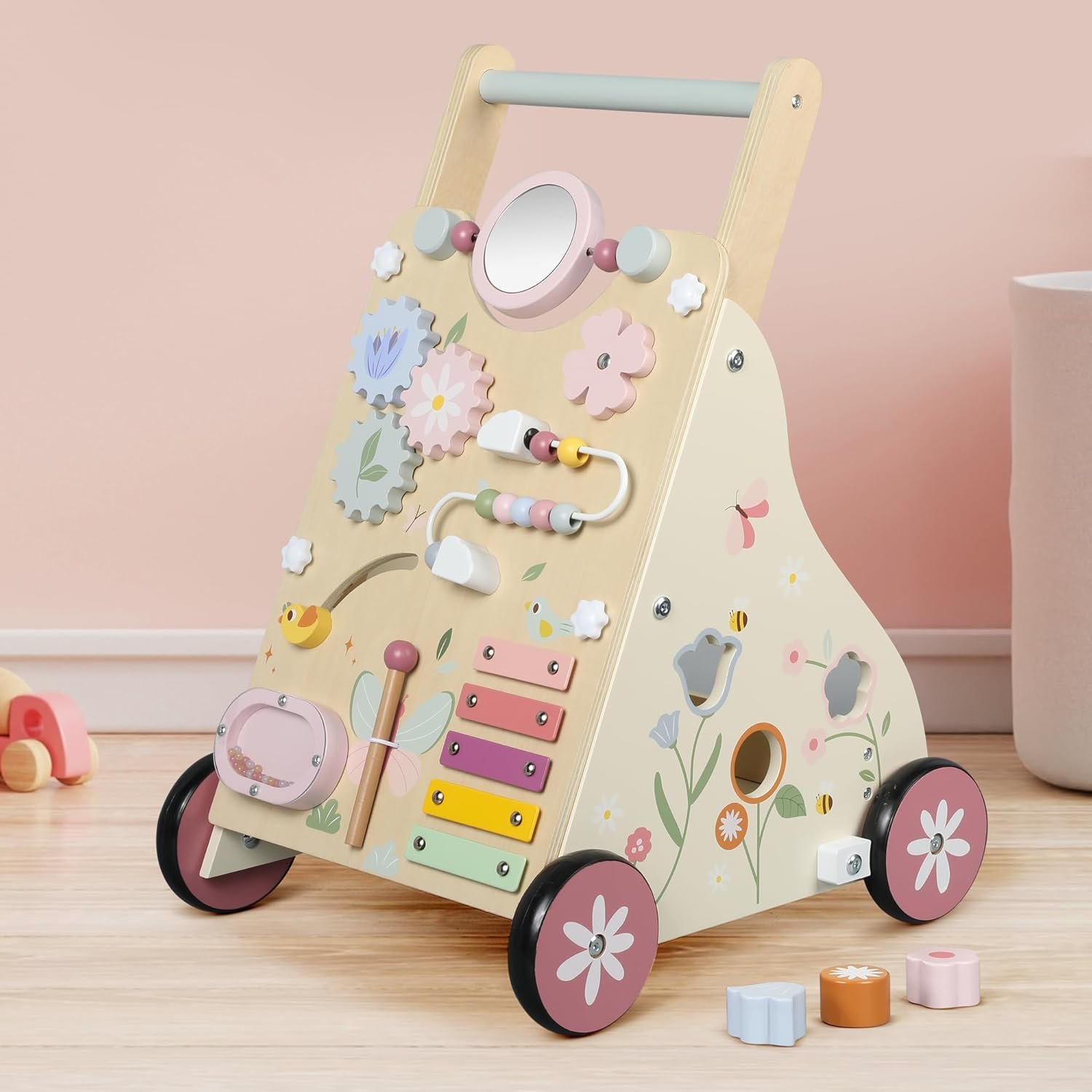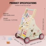 MULTI-FUNCTIONAL BABY WALKER: The Baby Push Walker comes equipped with many montessori sensory activity toys, including a mirror, bead maze, xylophone, spinning gears, shape sorter, and sound button providing a diverse range of play experiences for your baby.