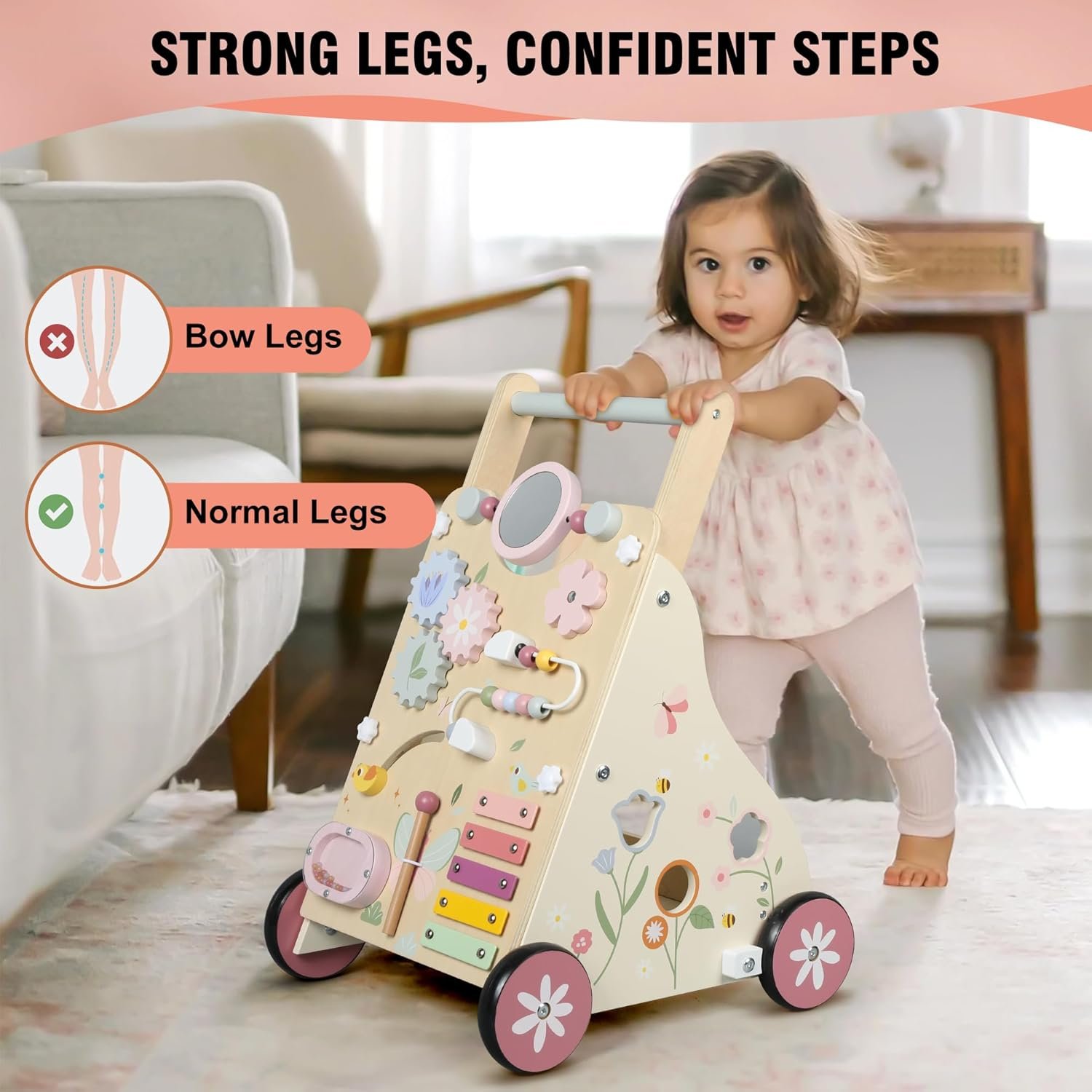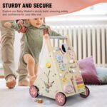 ALL-IN-ONE LEARNING AID: Meet our Wooden Baby Push Walker, a multifunctional tool supporting toddlers’ first steps while fostering curiosity and skill development.