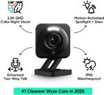 Experience unmatched home security with the Wyze Cam v4. Its 2.5K QHD resolution delivers crystal-clear images, day or night, thanks to Enhanced Color Night Vision. Motion-activated spotlight and voice warning features enhance security, while 24/7 local recording ensures no moment goes unnoticed. Easy installation, Bluetooth setup, and smart features like facial recognition and person detection make monitoring effortless. With Wi-Fi 6 support and integration with Alexa and Google Assistant, the Wyze Cam v4 offers reliable, convenient protection for your home.
