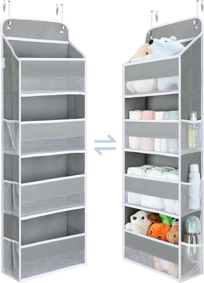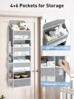 4 + 6 Large Capacity for Storage: The over door organizer hanging which is 42.52in x 13.78in x 5.5 in (H x L x W), boasts 6 mesh side pockets and 4-tier spacious storage bins. Each bin has a see-through mesh window for easy accessibility. The spacing between each tier, now increased to 4.33 inches, helps you accommodate different-sized items like wipes, toilet paper, snacks, and more daily necessities and baby items like newborn diapers. Meantime, side pockets are perfect to hold small items for tiny home.