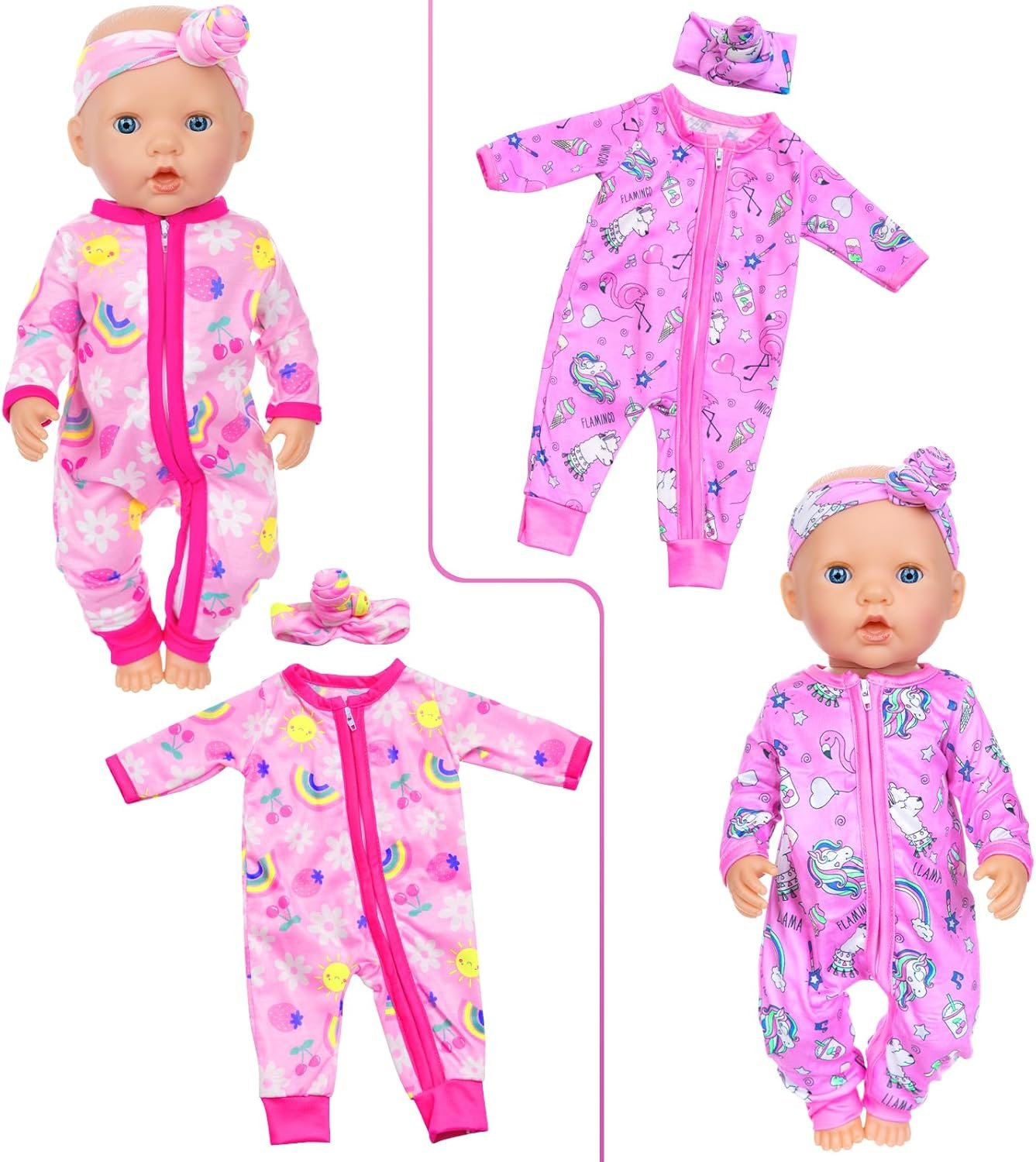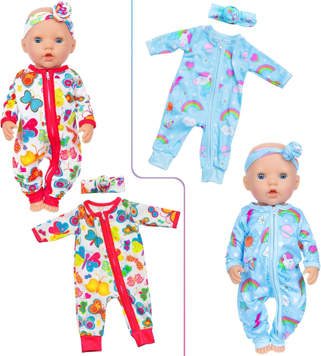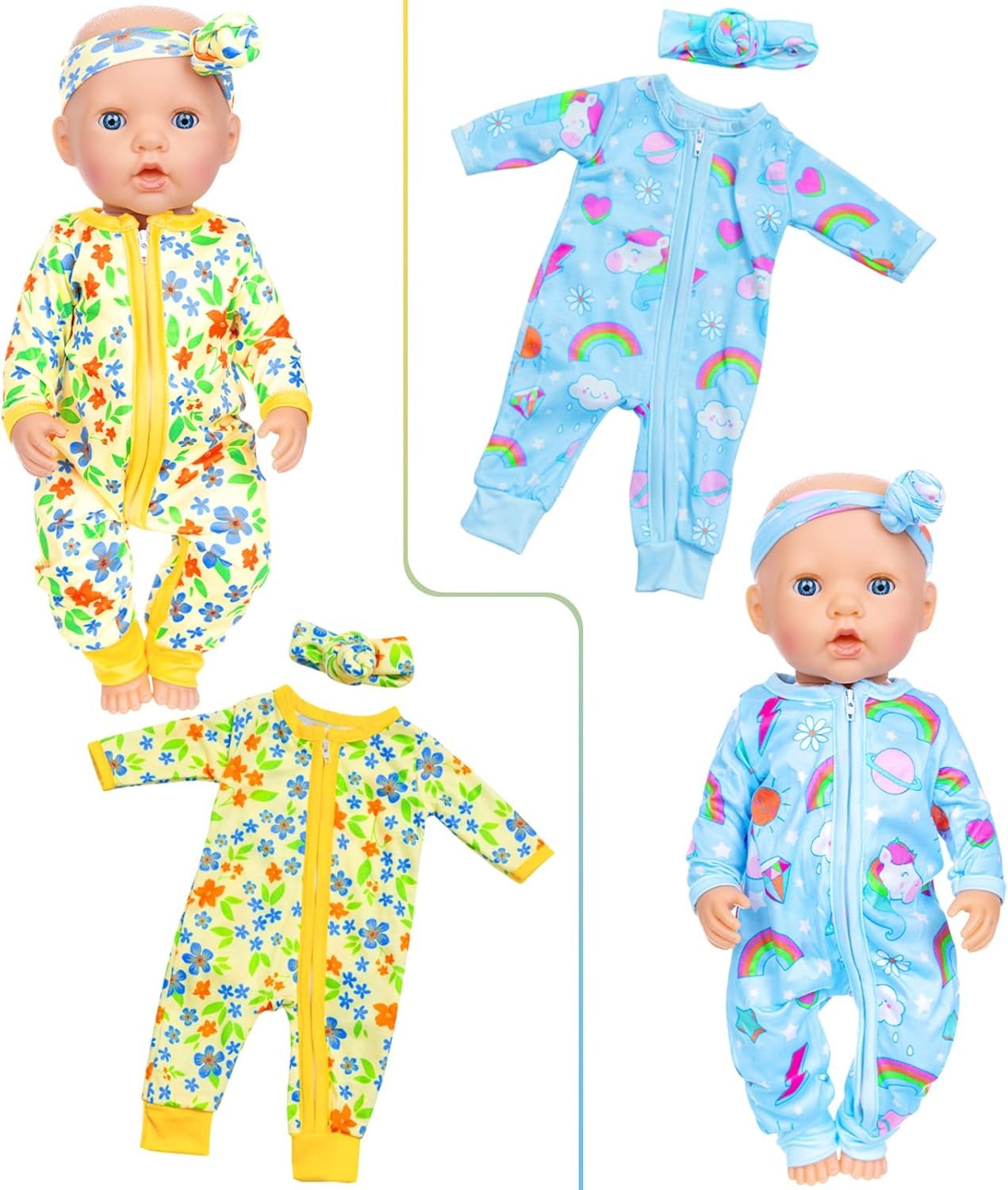 【Perfect Design】for 14-18 inch Baby Doll 1 unicorn and rainbow design blue jumpsuit + 1 strawberries and rainbow pattern pink jumpsuit + 1 floral design yellow jumpsuit + 1 Flamingo and cake design Purple jumpsuit + 1 colorful butterflies design jumpsuit